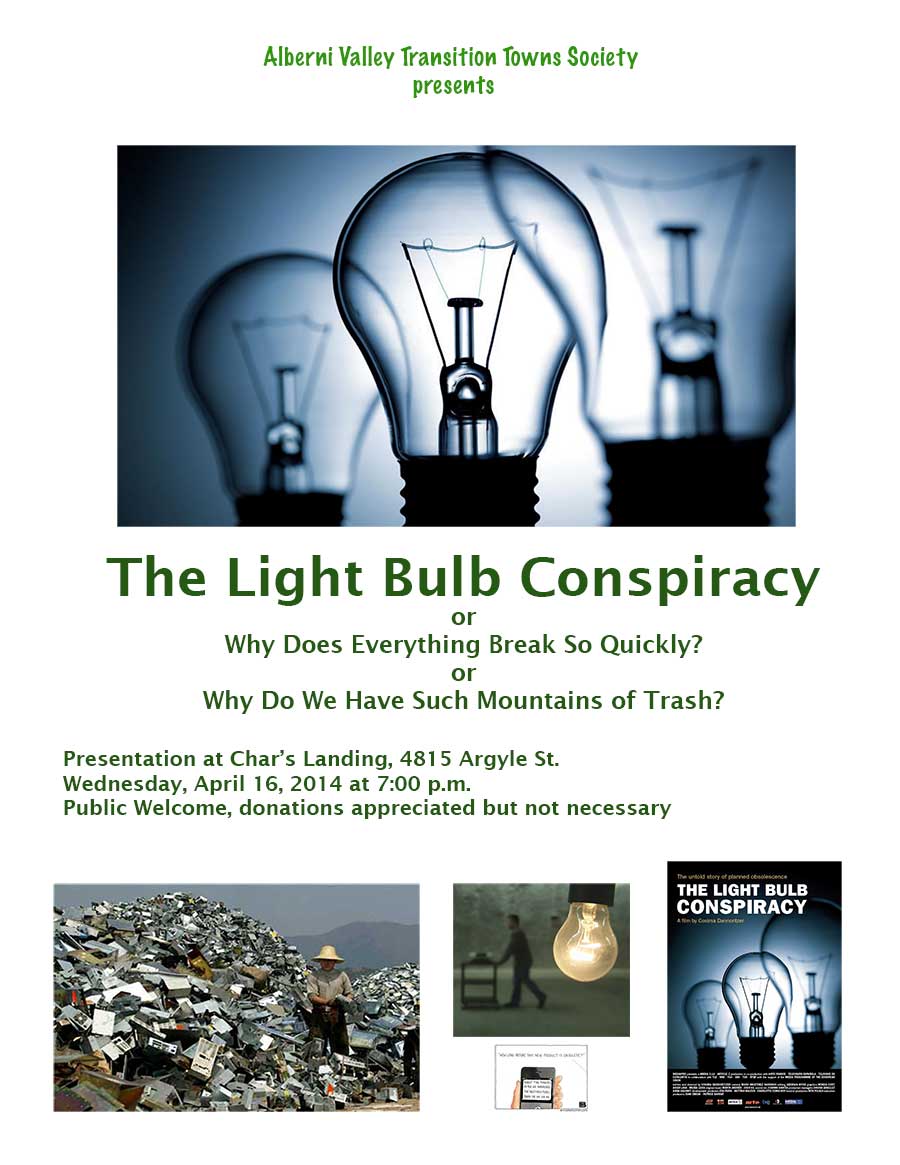 AVTTS will hold its monthly meeting at Char’s Landing, 4815 Argyle Street, on April 16, starting at 6:00 p.m. The meeting will be followed by a screening of the documentary The Light Bulb Conspiracy. The meeting and screening are open to the public, donations welcome but not obligatory.