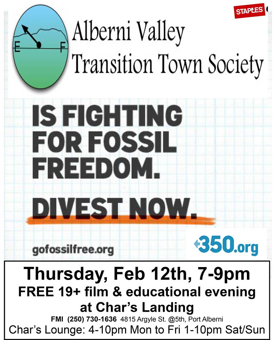The TT Education Committee will be hosting a presentation for Global Divestment Day on Thur. Feb. 12 at 7:00 PM at Char’s Landing.