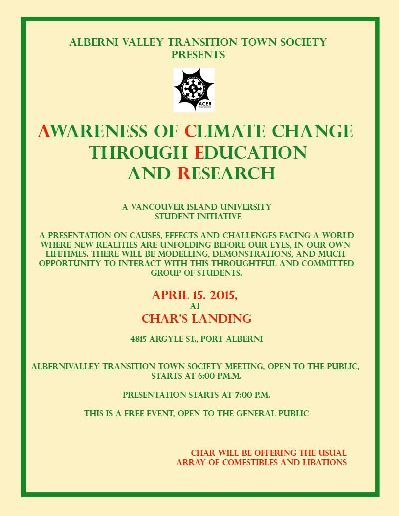 April meeting will be held at Char’s Landing at 6:00 p.m., April 15, 2015, followed by a Presentation by ACER, a group of students from VIU who are working to engage us in confronting the challenges of climate change. There should be much interactive material and local perspective. Come along, bring your friends.