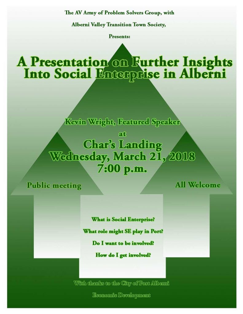 On behalf of the Shaun Loney (Army of Volunteers) Social Enterprise Group, AVTTS is hosting a presentation by Kevin Wright, recently back from attending a follow-up session at Royal Roads University. Kevin will run down content from the colloquium as well as present a couple of central ideas on which he’s been working hoping to expand the reach of social enterprise into the wider community. Pat Deakin has helped to facilitate Kevin’s attendance at the RRU session and has been consulting on Kevin’s projects. Please join us for the presentation and some directed discussion at Char’s Landing at 7:00 p.m. on Wednesday, March 21. This event is open to the public and we encourage those who might have missed Shaun Loney’s visit last fall to join the discussion. AVTTS folk will have their monthly meeting preceding the presentation, beginning at 6:00, which is also open to interested parties.