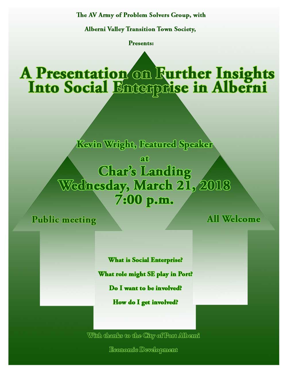On behalf of the Shaun Loney (Army of Volunteers) Social Enterprise Group, AVTTS is hosting a presentation by Kevin Wright, recently back from attending a follow-up session at Royal Roads University. Kevin will run down content from the colloquium as well as present a couple of central ideas on which he’s been working hoping to expand the reach of social enterprise into the wider community. Pat Deakin has helped to facilitate Kevin’s attendance at the RRU session and has been consulting on Kevin’s projects. Please join us for the presentation and some directed discussion at Char’s Landing at 7:00 p.m. on Wednesday, March 21. This event is open to the public and we encourage those who might have missed Shaun Loney’s visit last fall to join the discussion. AVTTS folk will have their monthly meeting preceding the presentation, beginning at 6:00, which is also open to interested parties.