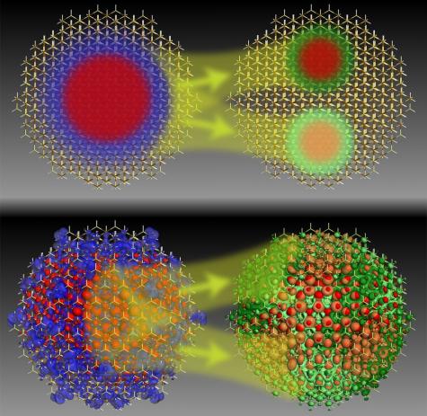 Illustration of multiple-exciton generation (MEG), a theory that suggests it is possible for an electron that has absorbed light energy, called an exciton, to transfer that energy to more than one electron, resulting in more electricity from the same amount of absorbed light. The left side shows an electron promoted to a high energy state (blue) plus the “hole” vacated by the electron (red). The right side shows the original exciton (now dark green/red) and a new exciton (light green/orange) after MEG. The top image shows a conceptualized version of the idea, while the bottom shows an actual exciton and bi-exciton using the same color scheme.