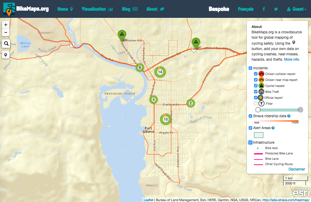 Cycle Alberni is partnering with BikeMaps.org to collect this data for Port Alberni. We encourage people riding bicycles to use the simple interactive tools on this website to record hazards that they see and experience while riding around town.
